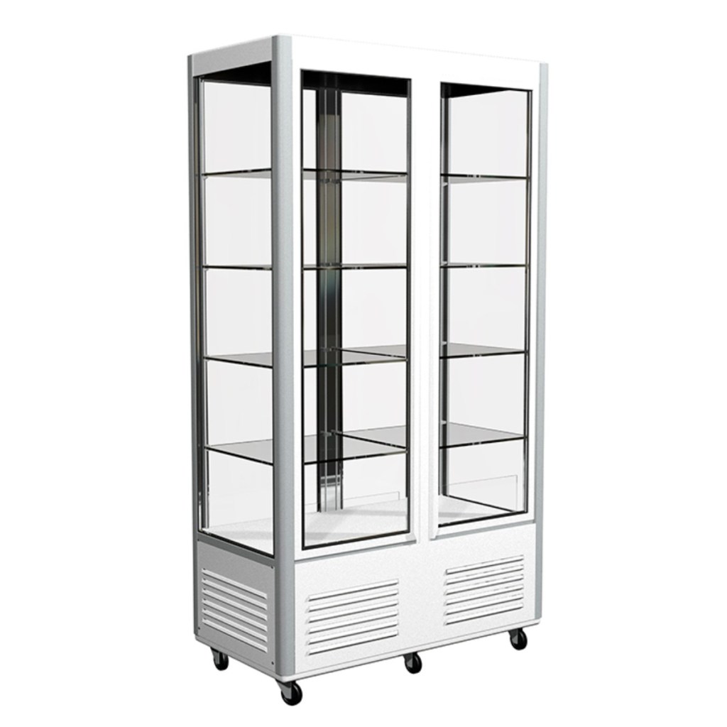 Модель оснащена динамической системой охлаждения, обеспечивающей равномерное распределение температуры по всему объёму, а двустворчатые стеклянные двери и панорамное остекление стенок обеспечивают отличный обзор продукции.