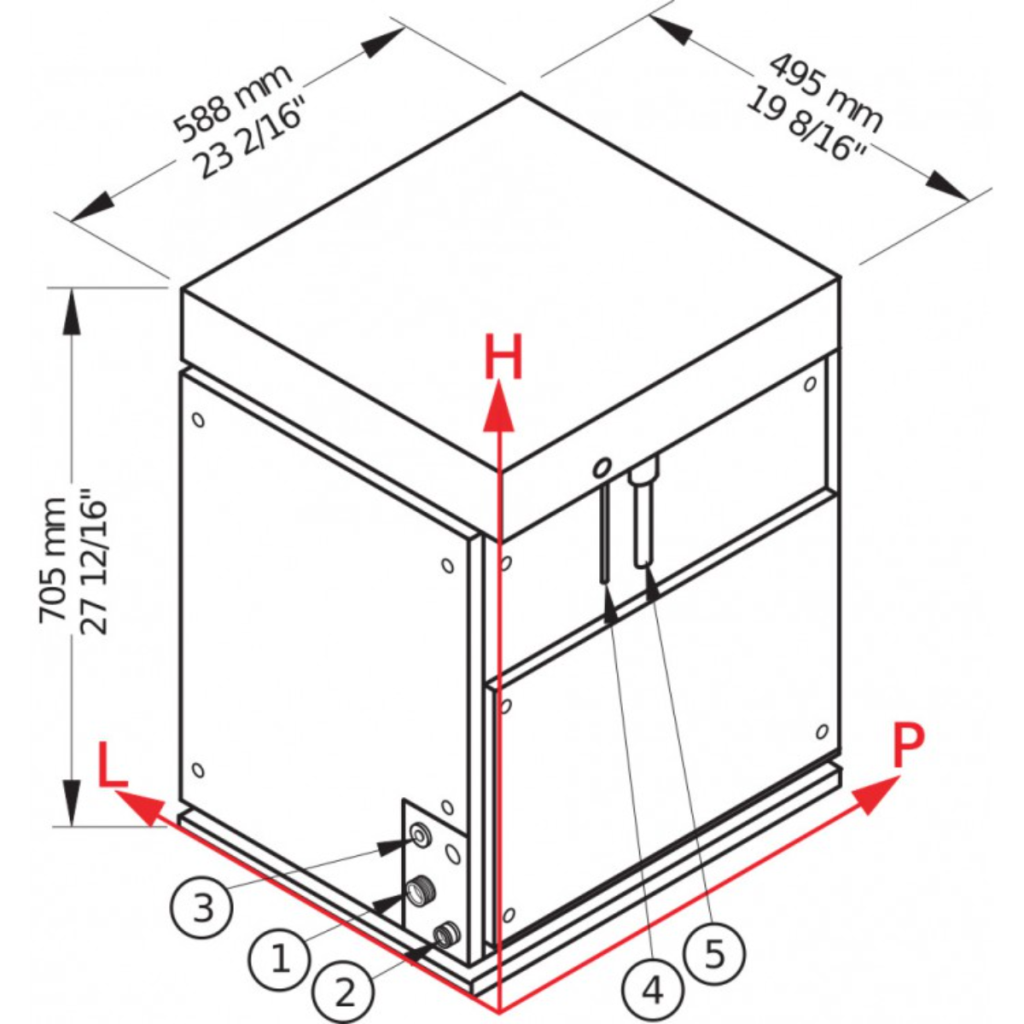 Корпус выполнен из нержавеющей стали AISI 304 с отделкой Scotch Brite, испаритель — из алюминиевого сплава Anticorodal, рама — из нержавеющей стали, отдельные детали — из пластика ABS. Модель оснащена электромеханическим управлением, вертикальным фиксированным испарителем «без утечек», очищаемым фильтром от накипи и хладагентом R452A.