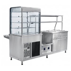 В зоне выкладки установлены три яруса полок-решеток, благодаря которым обеспечивается свободная циркуляция холодного воздуха. В центральной части размещена конфорка для размещения емкостей с первыми блюдами, а над мармитной частью расположены две дополнительные полки. Под охлаждаемой витриной предусмотрен закрытый нейтральный отсек для хранения кухонной утвари или посуды.