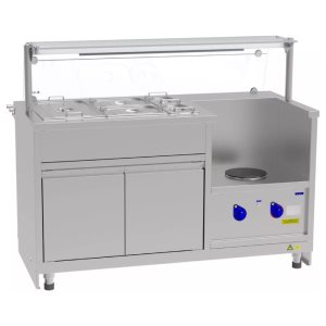 Электрический мармит универсальный Abat Hot-line ЭМКУ-70Х применяется для поддержания в подогретом состоянии различных готовых блюд, включая супы и горячие вторые, перед подачей посетителям. Для размещения продуктов используются гастроемкости, нагрев которых осуществляется при помощи водяного пара. Также предусмотрена конфорка диаметром 220 мм, которая позволяет дополнительно подогревать посуду при необходимости. Конструкция включает полку для размещения готовых продуктов и зону размещения кухонного инвентаря. Оборудование может интегрироваться в состав линий раздачи, так и устанавливаться в качестве самостоятельной единицы.