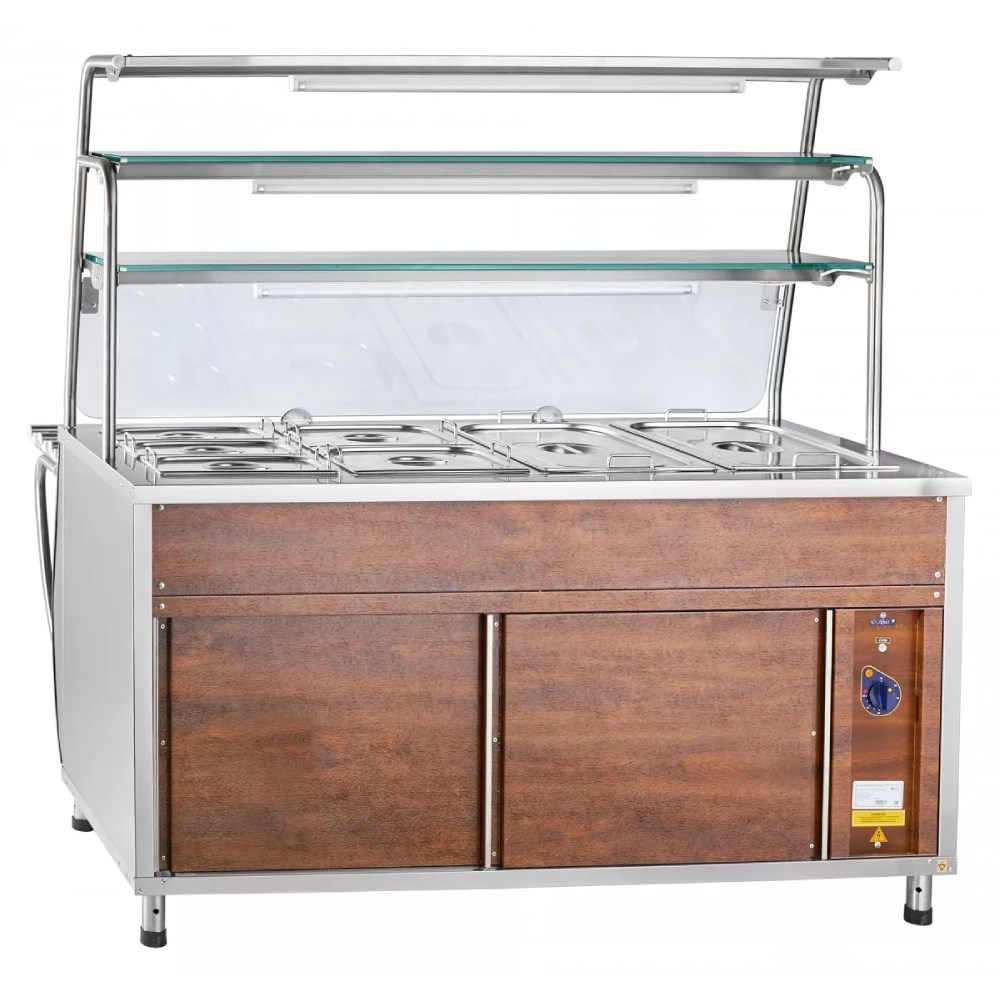 Корпус оборудования изготовлен из прочной нержавеющей стали, устойчивой к воздействию влаги и температурных перепадов. Для регулировки температуры предусмотрен плавный настрой, что позволяет адаптировать тепловой режим под разные блюда. Верхняя часть оснащена подсветкой, обеспечивающей хорошую видимость выкладки. Также в конструкции предусмотрены направляющие для перемещения подносов, упрощающие обслуживание клиентов.