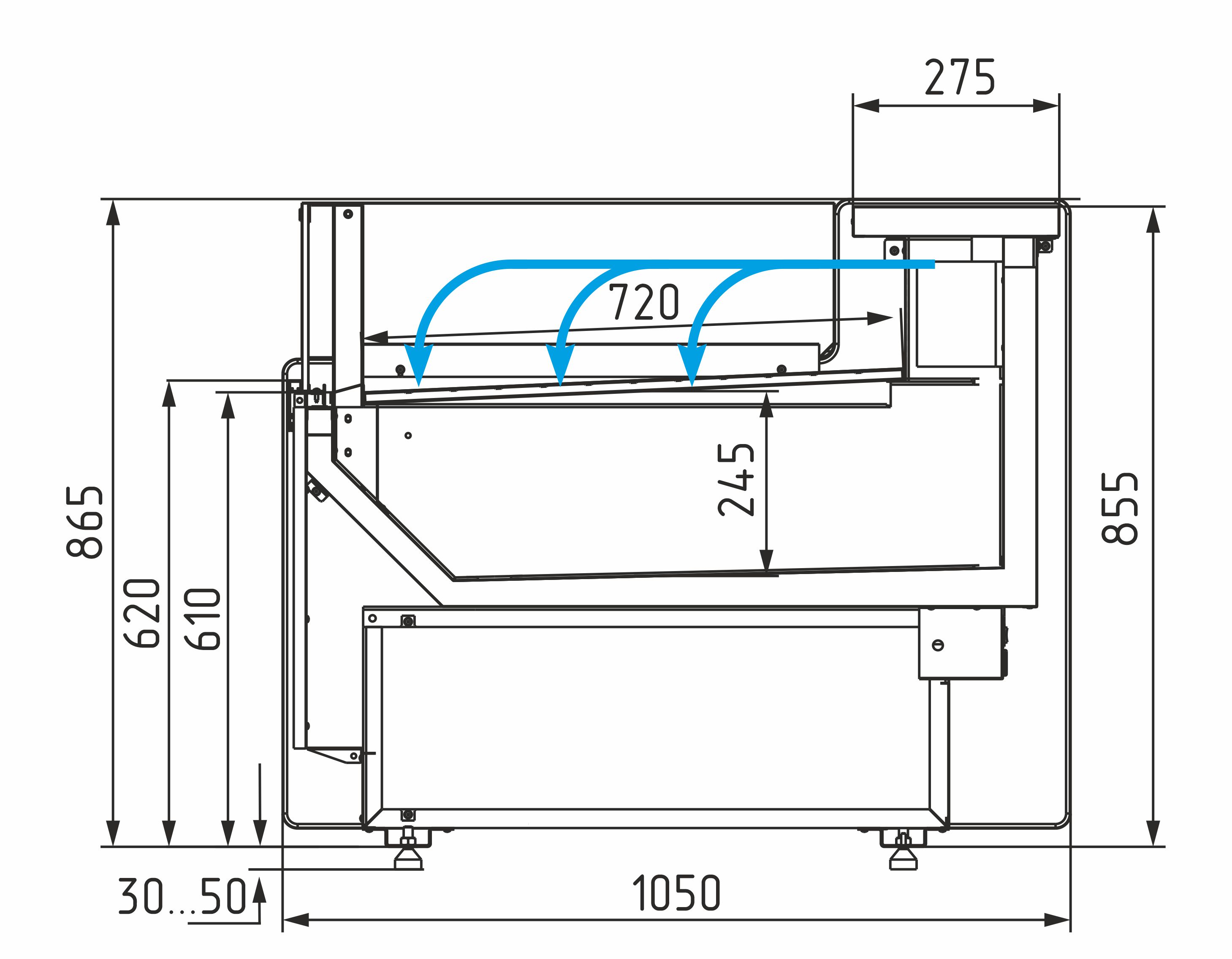 Фиксируемое фронтальное стекло — открывается вручную и фиксируется для удобной выкладки и обслуживания.