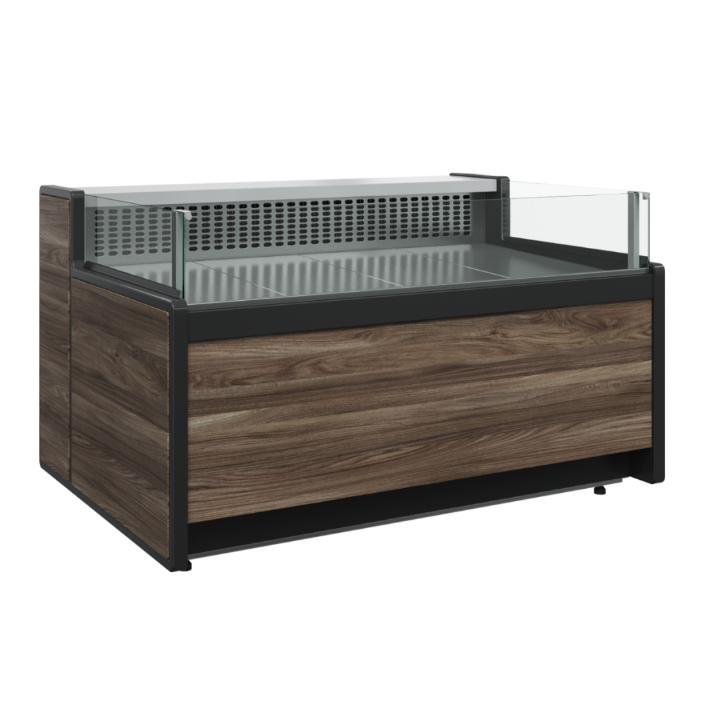 Модель оснащена энергосберегающими шторками, а столешница и экспозиционная поверхность выполнены из шлифованной нержавеющей стали, передняя панель — из ламинированного МДФ.