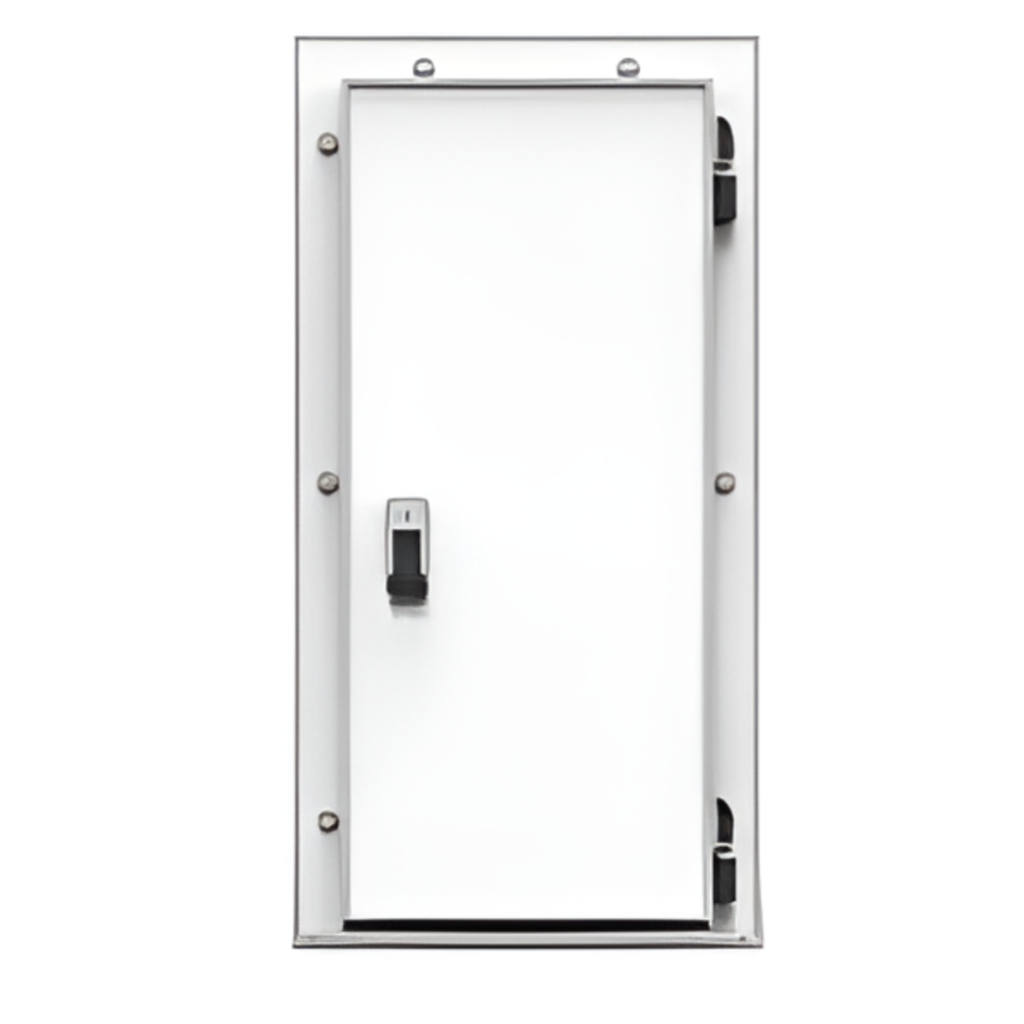• Конструкция: прочная рама из анодированного алюминия устойчива к коррозии, дверное полотно покрыто оцинкованной сталью толщиной 0,45–0,65 мм с полиэфирным слоем (RAL 9003), что обеспечивает долговечность и гигиеничность.