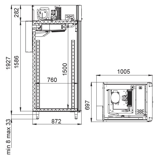 Каталог оборудования Холодильное оборудованиеШкафы холодильныеСпециализированные холодильные шкафыШкаф холодильный для вызревания салями Polair CS107 Salami со стеклом Шкаф холодильный для вызревания салями Polair CS107 Salami со стеклом Код товара: 062-631 Поделиться: WhatsAppTelegram СравнитьДобавить в КПВ избранное 0 385 050 ₽ В корзину 0 шт Под заказСамовывоз сегодня бесплатно Взять в кредит Купить в лизинг Получить консультацию в WhatsApp Описание Характеристики Отзывы 0 Инструкции 5 Шкаф холодильный для вызревания салями Polair CS107 Salami со стеклом предназначен для приготовления и хранения салями, сыровяленых колбас и других мясных деликатесов на предприятиях общественного питания и торговли. Корпус цельнозаливной конструкции выполнен из нержавеющей стали снаружи и внутри (кроме задней стенки), что обеспечивает высокую прочность и долговечность. Дверь выполнена в виде стеклопакета для удобного визуального контроля. Оборудование рассчитано на работу при температуре окружающей среды до +40 °С. Особенности: Динамическое охлаждение с мягким обдувом без заветривания Верхнее расположение агрегата Автоматическая оттайка с системой испарения конденсата Русифицированная многофункциональная панель управления с дисплеем 5" и возможностью создания и сохранения собственных программ Встроенный ультразвуковой увлажнитель (необходима подача очищенной воды и подключение к канализации) UV-лампа для обеззараживания воздуха внутри камеры 3 пары направляющих с тремя перекладинами и подвесами для колбас Регулируемый уровень влажности: от 60 до 95 % Распашная дверь с заливной теплоизоляцией, встроенной ручкой и магнитным уплотнителем Отключаемая внутренняя LED-подсветка Штампованное углубление в дне корпуса для удобства ухода Педаль для удобного открытия двери Хладагент R290 (пропан) Толщина стенки корпуса: 43 мм Polair CS107 Salami со стеклом — это профессиональный шкаф, разработанный специально для мясных деликатесов. Он обеспечивает оптимальные условия для ферментации и хранения продукции за счёт точного контроля температуры и влажности, продуманной конструкции и удобного функционала. Такой шкаф станет надёжным решением для мясных цехов, гастробаров и специализированных магазинов.Изображение товара, представленного на фото, может отличаться от его фактического вида. Показать все Габаритные размеры697×1005×1960 ммДиапазон рабочей температурыот -2 до +30 °CДлина697 ммШирина1005 ммВысота1960 ммОбъём700 лКол-во дверей1 Тип двериСтеклянная Уровень влажностиот 60 до 95 %Холодильный агрегатВстроенный Тип оттайкиАвтоматическая Тип охлажденияДинамическое ПодсветкаЕсть UV-лампаЕсть ХладагентR290 Вес нетто160 кгВес брутто190 кгБрендPolairВсе специализированные холодильные шкафы Из нержавейкиВсе специализированные холодильные шкафы Стеклянная дверь Оставить отзыв Еще никто не оставил отзыв на этот товар Схема POLAIR CS107 Salami.jpgИнструкция на POLAIR CS107 Salami.pdfБрошюра на POLAIR CS107 Salami.pdfДекларация о соответствии.pdfСертификат соответствия.pdf Похожие товары Перейти в каталог В наличии 186 231 ₽ Шкаф холодильный HURAKAN HKN-MA230 для созревания мяса Под заказ 402 050 ₽ Шкаф холодильный для вызревания мяса Polair CS107 Meat со стеклом (Тип 2) Под заказ 392 700 ₽ Шкаф холодильный для вызревания мяса Polair CS107 Meat черный, со стеклом (Тип 2) В наличии 397 290 ₽ Шкаф холодильный для хлебопекарных производств Polair CS107 Bakery Br (Тип 1) Под заказ 389 300 
