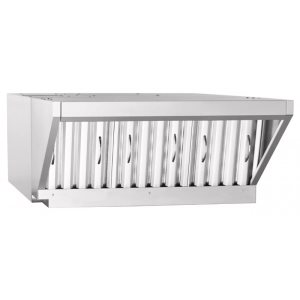 Корпус зонта выполнен из нержавеющей стали, устойчивой к коррозии. Устройство подключается к однофазной сети 220 В и требует обязательного заземления. Производительность составляет 1400 м3/ч, что гарантирует эффективную очистку воздуха. Фильтры просты в уходе: решетки очищаются без специальных средств. Пароконденсатор оснащен теплообменником с шестью замкнутыми контурами, заполненными хладагентом, а конденсат отводится через дренажный патрубок с резьбой G 1/2".